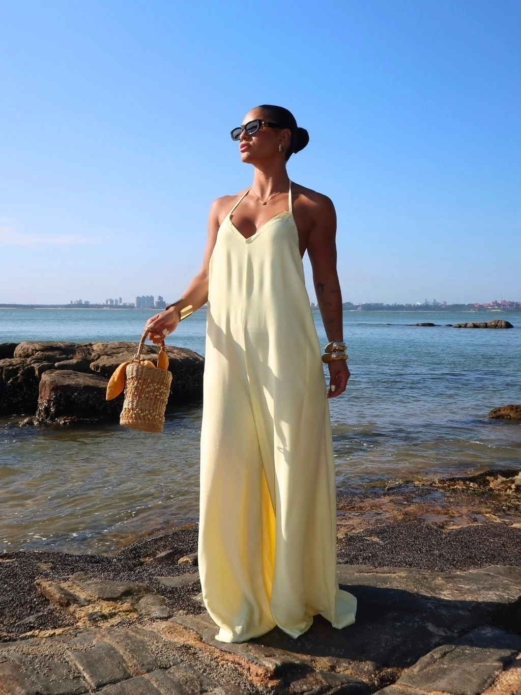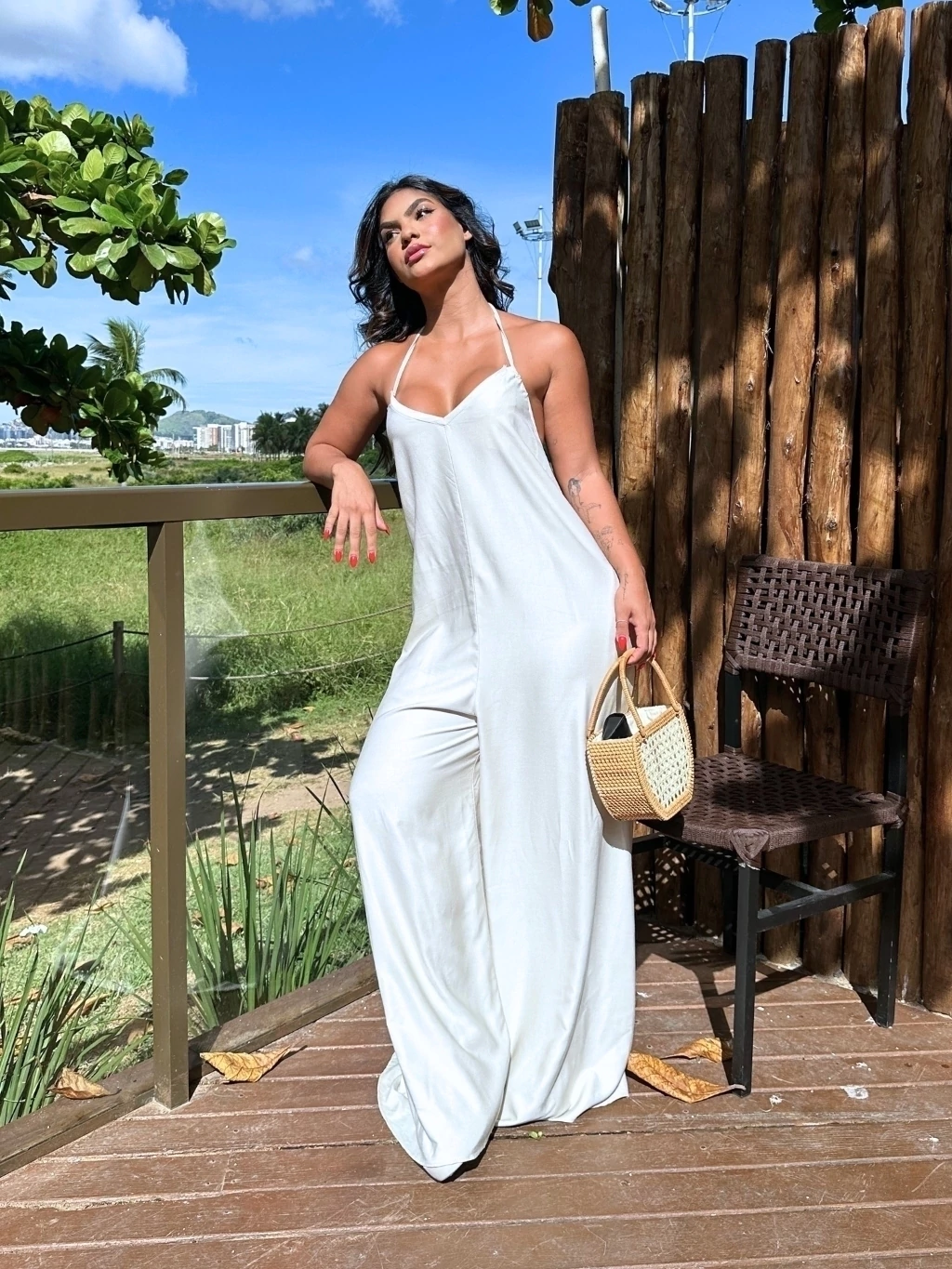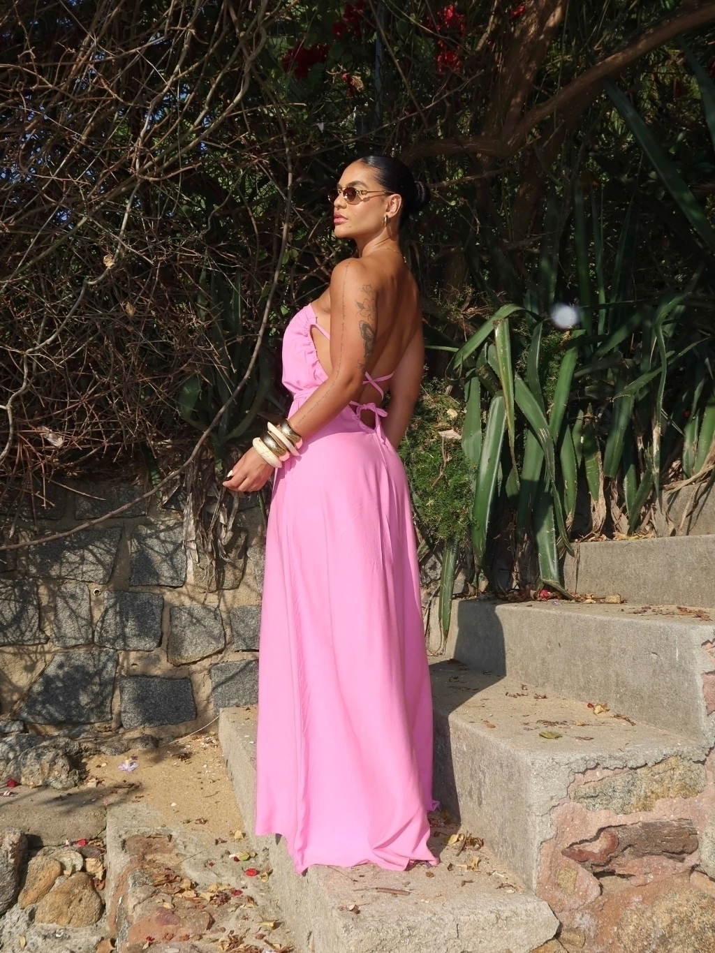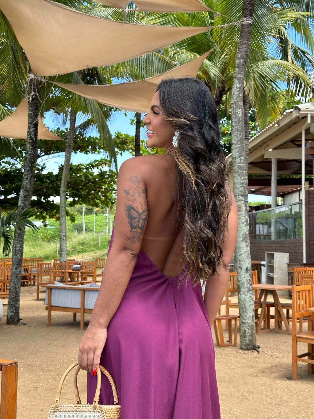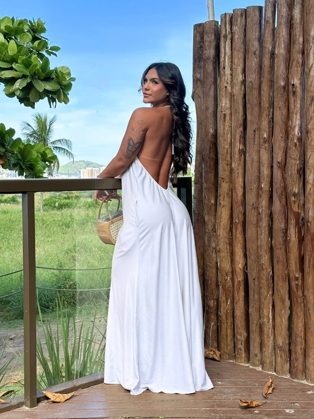 O tecido é super leve, então você vai se sentir super à vontade. E olha só, ele tem um decote frontal mais discreto, mas quando você vira... as costas ficam abertas de um jeito incrível, bem glamouroso! 😍