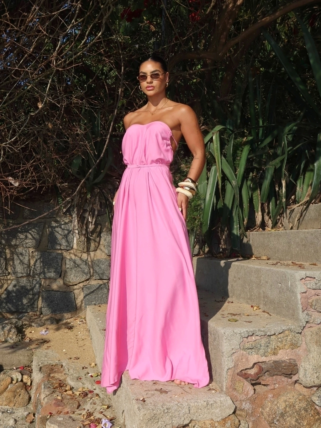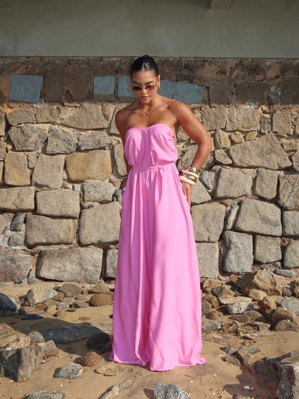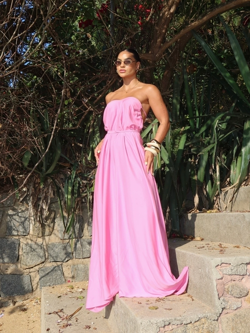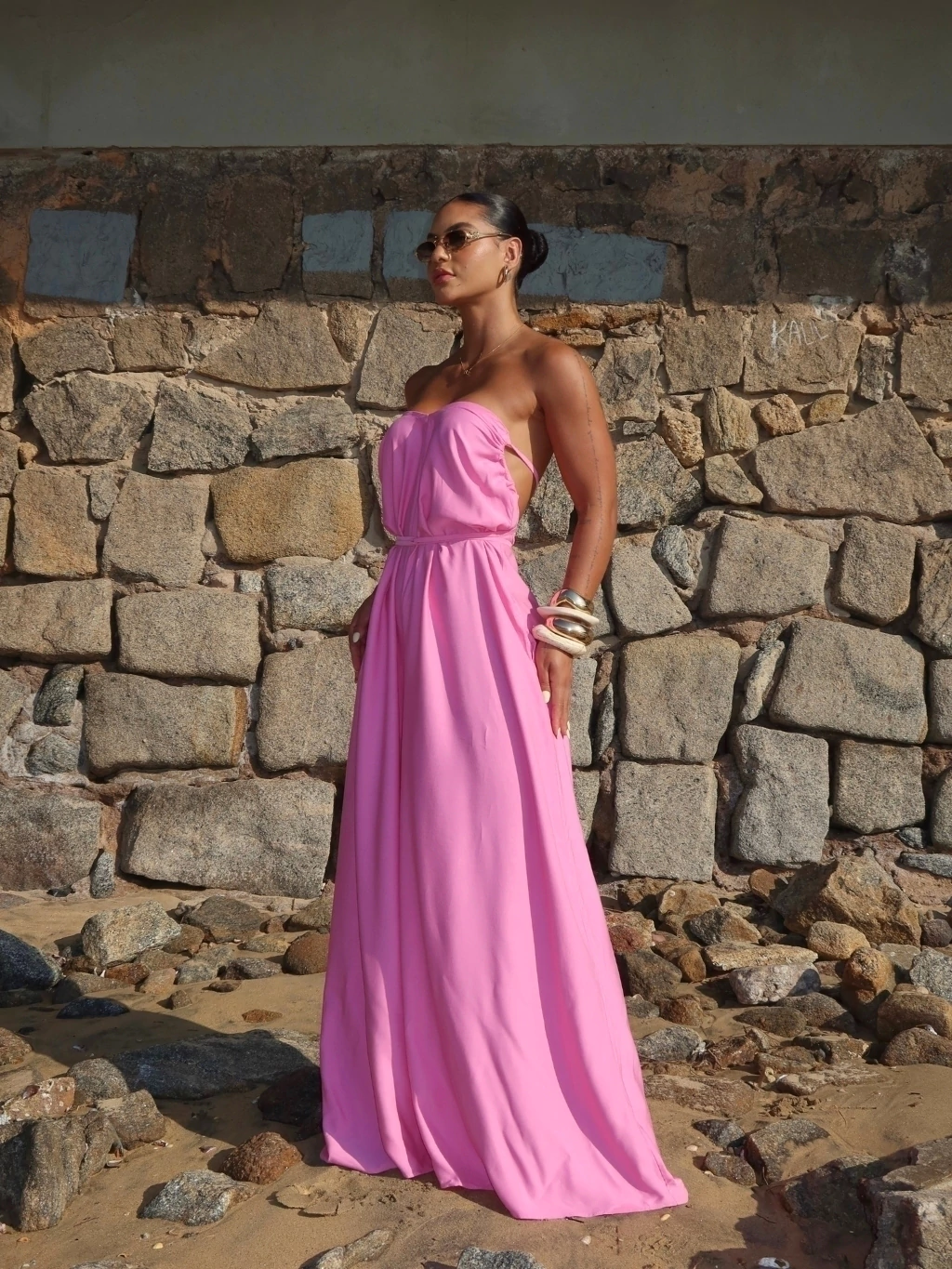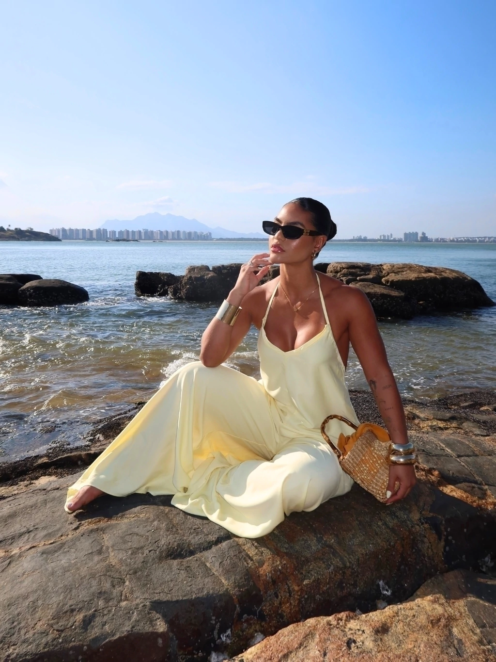 O tecido é super leve, então você vai se sentir super à vontade. E olha só, ele tem um decote frontal mais discreto, mas quando você vira... as costas ficam abertas de um jeito incrível, bem glamouroso! 😍