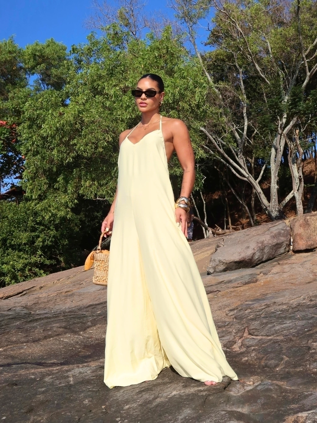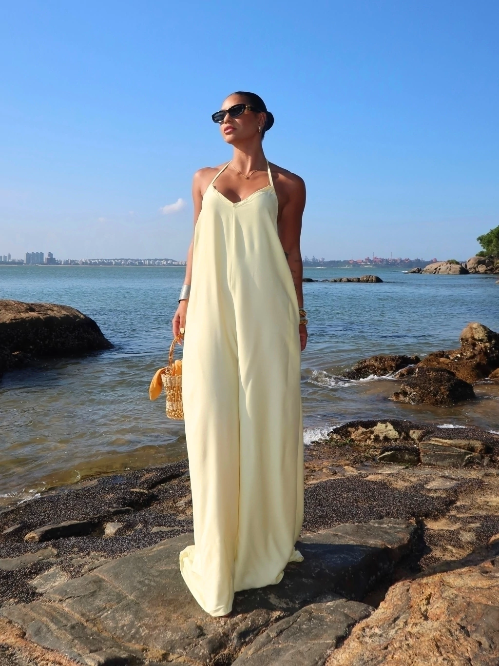 Com uma abundância de tecido, esse macacão oferece um caimento impecável e uma fluidez perfeita. Seu design incrível combina o decote frontal moderado, adicionando um toque de sofisticação, com um decote profundo nas costas, revelando um charme irresistível e deixando suas costas nuas de forma glamorosa.